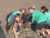 Day 5) We play mini putt in the morning in Queenstown, and then left for our farmstay in Wendonside after lunch. Dale and Lindsey Wright own a 1200 acre sheep and cattle farm. The core of the farm has been in Lindsey's family for 4 generations, and they have expanded it by buying a number of surrounding farms. They currently have about 4000 producing ewes, a handful of rams, a bunch of hoggets (year old ewes grown as 'replacement ewes' for next year), and about 5000 lambs. We arrived by chance when a neighbouring farm was shearing their sheep, and Dale told us to go watch the shearing team in action. Individual shearers can do about 250 sheep per day and there were 3 working on the flock. The wool comes off in a mat, which is then cleaned up a bit and baled by three helpers. The bales go to auction, and most end up in carpets. The big money for the farmers at the moment comes from selling lambs. Lindsey was telling us it is the first good year they have had in years. New Zealand has done very well at dominating world lamb, wool, and kiwi fruit markets - not bad for a country of under 4 million people. By the way, if you believe in reincarnation, try not to come back as a male lamb. Or as a lamb of either sex with a black face. Your days are numbered! It was interesting at the farmstay. We arrived as guests and left as friends. At both supper and breakfast it was a quandary - are we paying guests or do we help clean up? The kids had fun and learned lots, but I think we had hoped to be a bit more active. Liability insurance strikes again... we could only watch everyone else busily working. Day 6) We had a great breakfast at the farm and drove to Te Anau near Milford Sound. We found a terrific villa at the Edgewater XL Motel right by the lake. It had 2 bedrooms, kitchen, dining room, living room with extra bed, bathroom, laundry room and sun room. Mark and Chloe fished in a local lake (still no luck though). Sarah and I caught up on the web site and e-mails, while Heather was bored (!). Day 8) We left Te Anau and drove to Invercargill. On the way, we stopped at the Te Anau Wildlife Centre to see a Takahe (only 200 of these birds left). We also stopped at the Clifden Suspension bridge. Built in 1899, this 50m bridge spans a river that, according to Mark, has no fish in it -although he did get a bite. Sarah bought a hand spun, dyed and woven blanket at a woolen shop in Colac Bay. We were given a tour of a small Paua (NZ abalone shell) factory in Riverton where they polish and shape the shells into the jewellery that we have seen in many stores around New Zealand. In the evening, we went to Splash Palace, a terrific 50 m pool with wave pool and water slide. We spent the night at the Garden Grove Motel in Invercargill. Day 9) Mark and I golf at Queen's Park in Invercargill. This was a short course by NZ standards: around 6000 metres (6600 yards)! It was very inexpensive for such a nice course. The total cost was about $35Cdn for club rental (the only 2 left handed sets they had), green fees for both of us, 4 balls, and a bag of tees. It was Mark's first time playing with adult size clubs, and I think I am in trouble. On my better drives, I was outdriving him by only about 15 yards. Sarah and the girls went to the zoo and aviary at Queen's Park. That night, we went to see the movie "Harry Potter and the Philosopher's Stone "at the local theatre. It was a very civilized theatre: we were able to buy tickets in advance and actually reserve seats. Harry Potter had only opened the day before in New Zealand. Our review? - we thought it was good, the special effects were excellent, but we all liked the book better. We spent the night at the Garden Grove Motel again. Day 12) We spent the morning cajoling the kids to do homework again. Heather went to Kylie's school in the afternoon - it is Kylie's last week of school before summer holidays, so it was a good time for Heather to visit. In the evening, Bronwyn, Trevor & family invited us to join them for 'tea' (supper) at their local favourite restaurant. Every motel we've been at so far in New Zealand has been very good, but Trevor and Bronwyn's hospitality have certainly made the Catlins Gateway exceptional. We were intending to stay one night but ended up staying three. Day 13) We left Owaka after looking for Mark's jade dragon pendant for an hour or so. He bought it in the market in Beijing. It did not cost much, but he liked it. It has unfortunately come off somewhere in Owaka and we were not able to find it. We drove to Dunedin and got a room at the Chequers Motel. Day 14) Rain. We rode on the Taieri Gorge Railway for the day. The rail line was formerly used to transport produce and livestock to market from the interior. Now it is a tourist trip up a very picturesque gorge. Mark was discouraged to learn that the trout die of old age in the river... there is no one there to fish for them. On our return, our little car struggled to make it up Baldwin Street - The Guiness Book of World Records 'steepest street in the world'. There is an amazing 1 metre rise for every 1.266m of run. If it snowed, this would be a black diamond ski run! It was raining, and we actually got stuck part way up. Day 15) Overcast and light rain. We went to the Royal Albatross Centre at Taiaroa Head on the tip of the Otago peninsula. This is the only mainland viewing spot for nesting Royal Albatrosses, as they normally prefer desolate and barren islands. They build their nests on the grassy slopes with no protection whatsoever, so they are open to any of the many introduced predators here: rats, cats, ferrets, possums, and stoats. Albatrosses look like oversize gulls - wingspans can reach 3m. They spend most of their life flying around the southern oceans. In fact, when the chicks leave the nest on their first flight, the next time they touch land is when they come back to choose a mate in 3 to 6 years. They then return every two years to mate. Awkward on land, albatrosses are ex